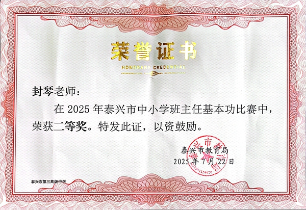泰兴市中小学班主任基本功二等奖——封琴