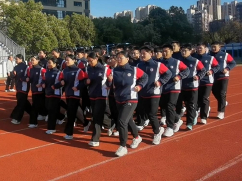 跑操比赛步伐协调展示团队默契,口号嘹亮彰显班级凝聚力,方阵齐整焕发蓬勃朝气。