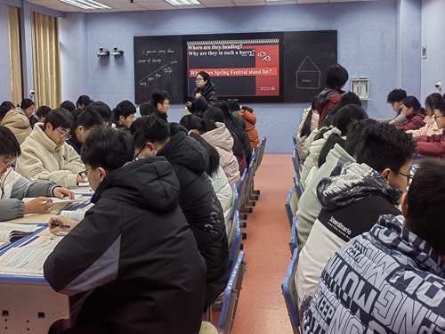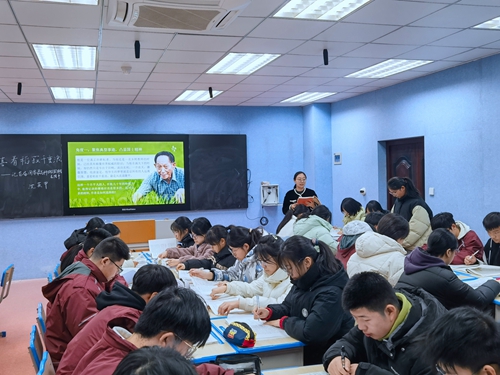 在英语课《Extended reading: A precious family dinner》上,周菊香老师担当文化使者,以“珍贵的年夜饭”创设情境,探究“春节”的主题意义。教学过程中,以时间、地点为明线,心情变化为暗线,整体把握全文;层层递进设计问题链,引导学生细读文本,体会新时代中国人的生活、观念、思想、情怀,以及传统与现代的交融;注重德育浸润,让学生感知和体验春节团圆所承载的文化意义与家国情怀。