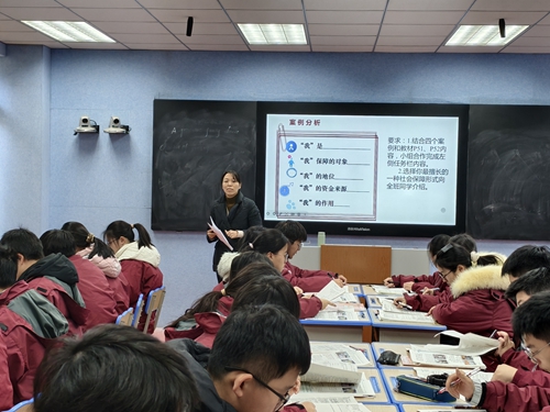 任仙老师讲授《我国的社会保障》,似社会问题百事通,围绕医保、养老金热点抛出问题,学生分组展开头脑风暴。展示社保案例后,让学生交流讨论,解析社会保障守护百姓的路径,培养学生的政治洞察力,明晰责任担当。