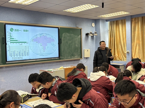 薛迎庆老师讲《人口分布》,似智慧探险家,大数据可视化地图呈现全球人口疏密,对比鲜明。动态模型演绎迁徙轨迹,学生们围站四周,好奇观察,分组探讨影响因素,以手抄报形式总结探究成果,思索人类与地球关系。各小组展示作品,相互学习借鉴。