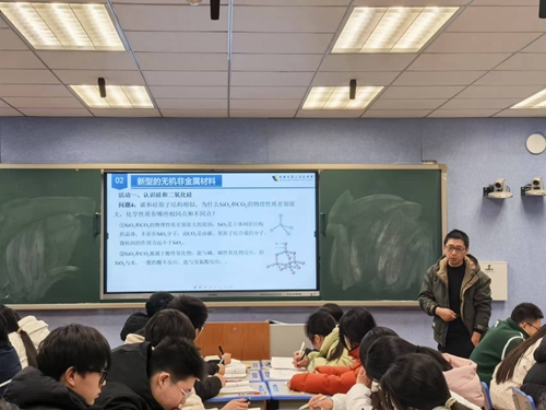 化学课《无机非金属材料》中,王飞老师扮演材料魔法揭秘者,巧妙运用多媒体演示等教学手段,以生活中常见的陶瓷花瓶、玻璃幕墙、水泥建筑等图片和实物展示作为课程导入,成功吸引住学生的注意,激发了他们对无机非金属材料的好奇心和学习兴趣。