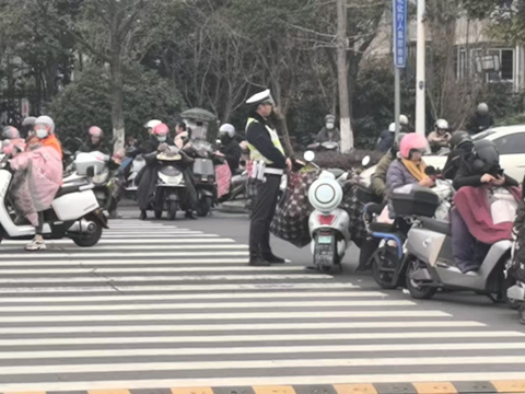 安保人员则负责引导校门口接送学生家长的车辆有序停放,并联合校门口值勤交警,对骑乘电动车不佩戴头盔的行为进行整治。