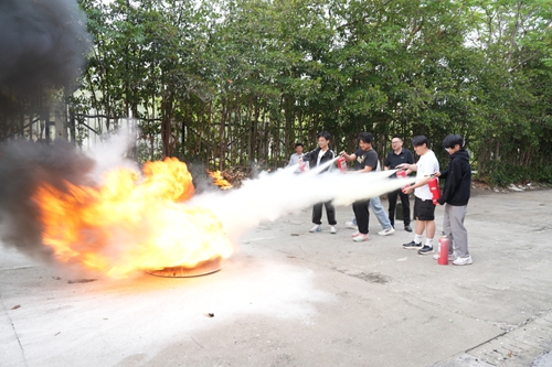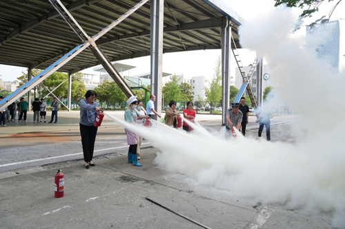 在消防安全员的专业指导下,部分师生代表亲身体验了使用灭火器灭火的过程。