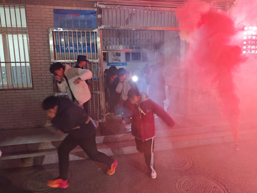 夜间逃生。演练的重头戏是宿舍夜间逃生专项演练,在正式演练前,教官专门针对夜间光线暗、人员处于休息状态等特殊情况,详细讲解了夜间逃生的技巧和注意事项,强调了 “湿毛巾捂口鼻、弯腰贴墙走、轻声有序撤离” 的核心原则。随着警报响起,住宿生立刻用湿毛巾捂住口鼻,弯腰贴墙,有序向楼道移动。楼层配备的逃生电筒提供了清晰指引,各楼层安全员引导学生避开楼道拐角和电梯口等危险区域。大家严格遵循 “先低楼层、后高楼层,先东侧楼道、后西侧楼道” 的科学分流原则,快速向指定安全区域撤离。撤离完毕,值班人员迅速清点人数并及时上报,过程紧张有序、规范高效。