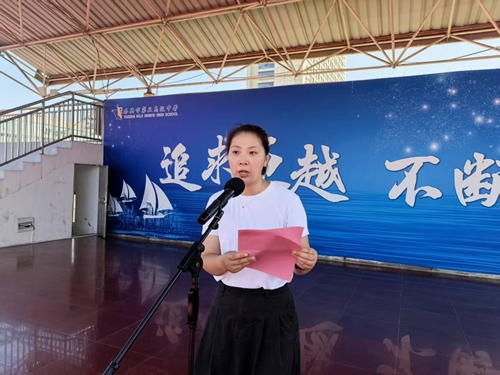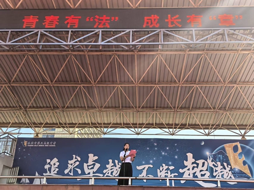 谢颖颖作“青春有‘法’ 成长有‘章’”的国旗下讲话。她通过真实案例,引导大家思考应当如何以法为盾走好青春每一步。